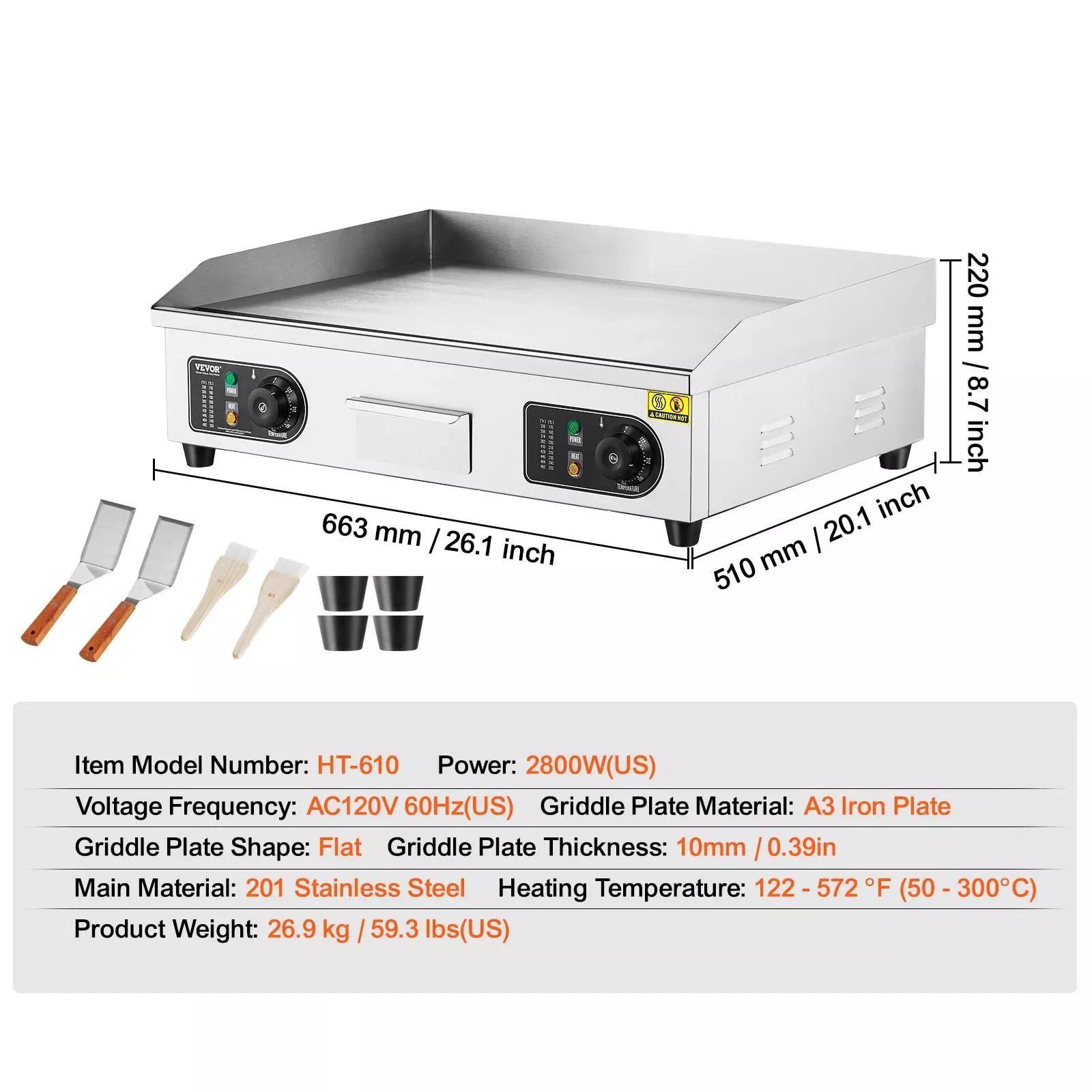 26 Inch Commercial Electric Flat Top Griddle 2800W Countertop Grill