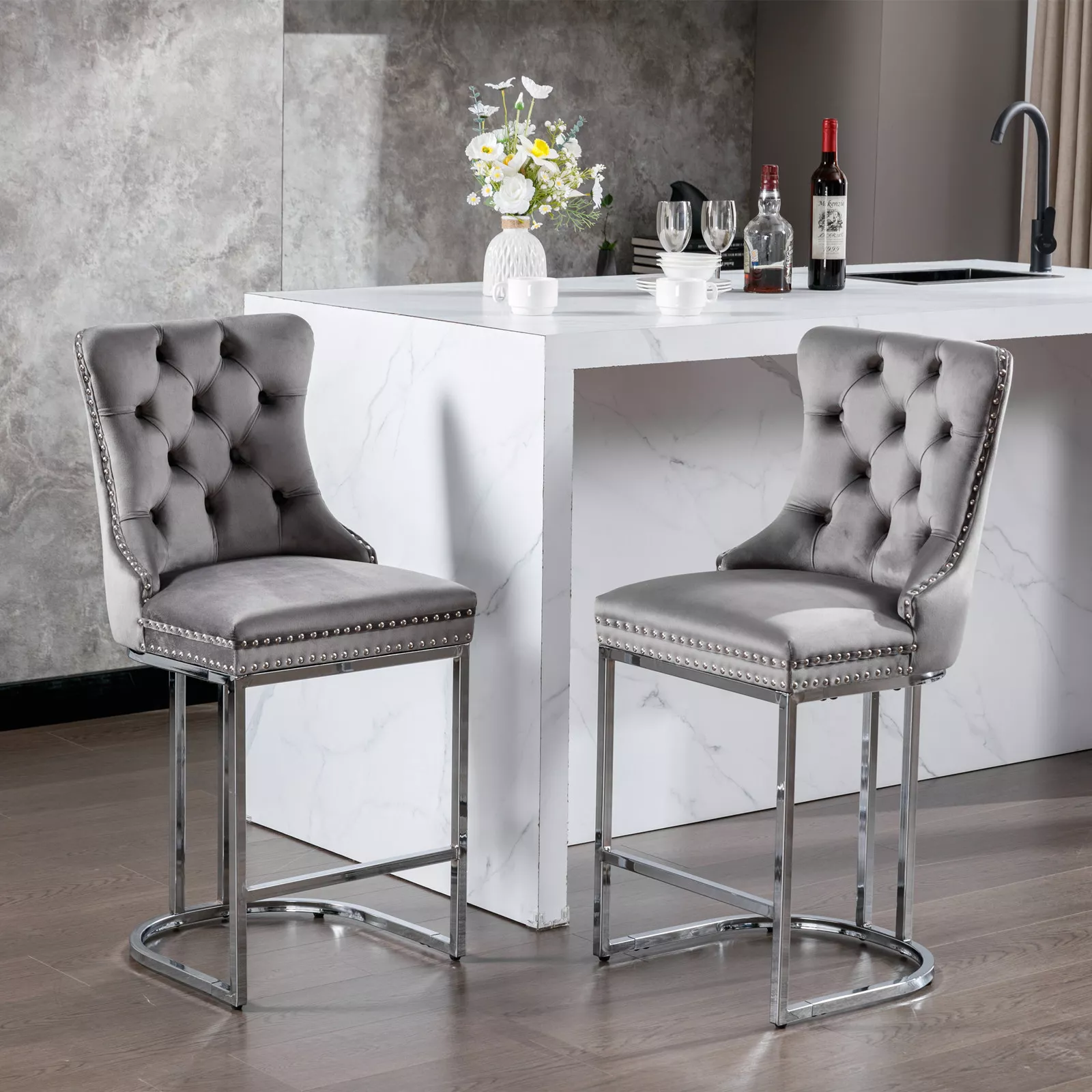Bring a touch of modern sophistication to your home with these 26-inch counter height dining chairs. Designed with elegance and comfort in mind, these upholstered bar stools feature a smooth velvet finish and decorative rivets that exude mid-century charm. Whether placed in your kitchen, dining area, or home bar, their sleek chrome base and refined silhouette make them a stunning addition to any décor.