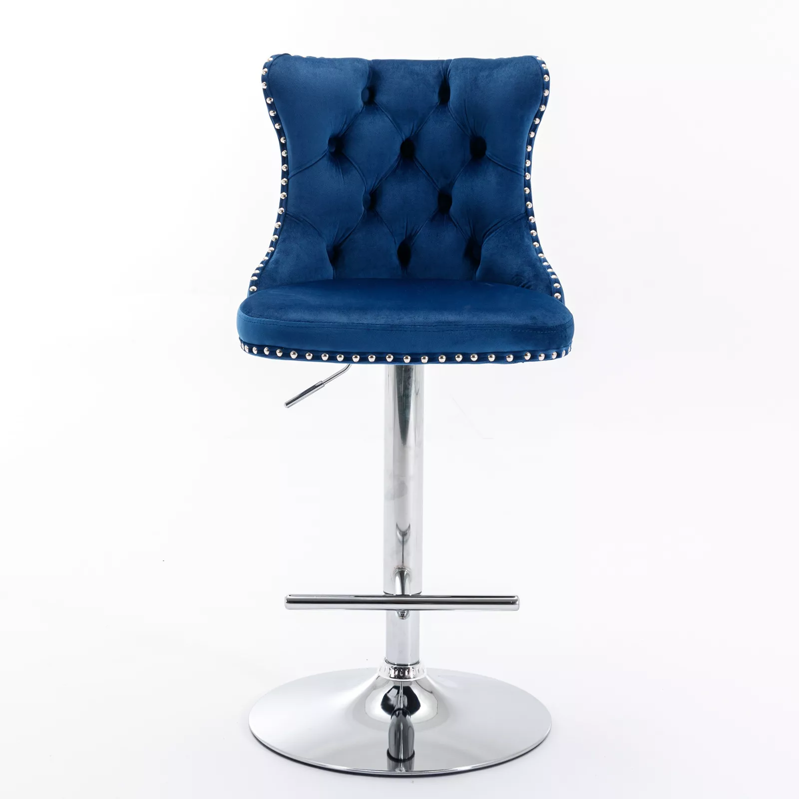 Each stool made of sturdy metal frame that supports up to 250 lbs. The shiny T-shaped footrest complements the elegant velvet seat, while decorative rivets add a refined edge. The high-density sponge padding and ergonomic backrest ensure maximum comfort, allowing you to relax through long conversations or meals.