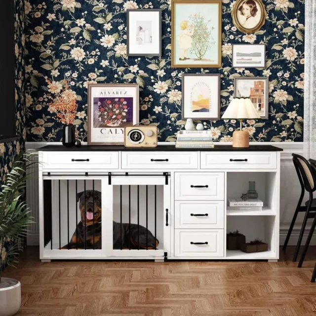 This isn’t just a crate—it’s a multifunctional piece of furniture that keeps your home organized. Featuring 2 drawers and 4 open shelves, it provides plenty of space to store your dog’s toys, treats, leashes, or your own books and décor. Measuring 47.2” L x 23.6” W x 33.5” H, it also offers a large top surface that’s perfect for displaying plants, photos, or even your TV.
