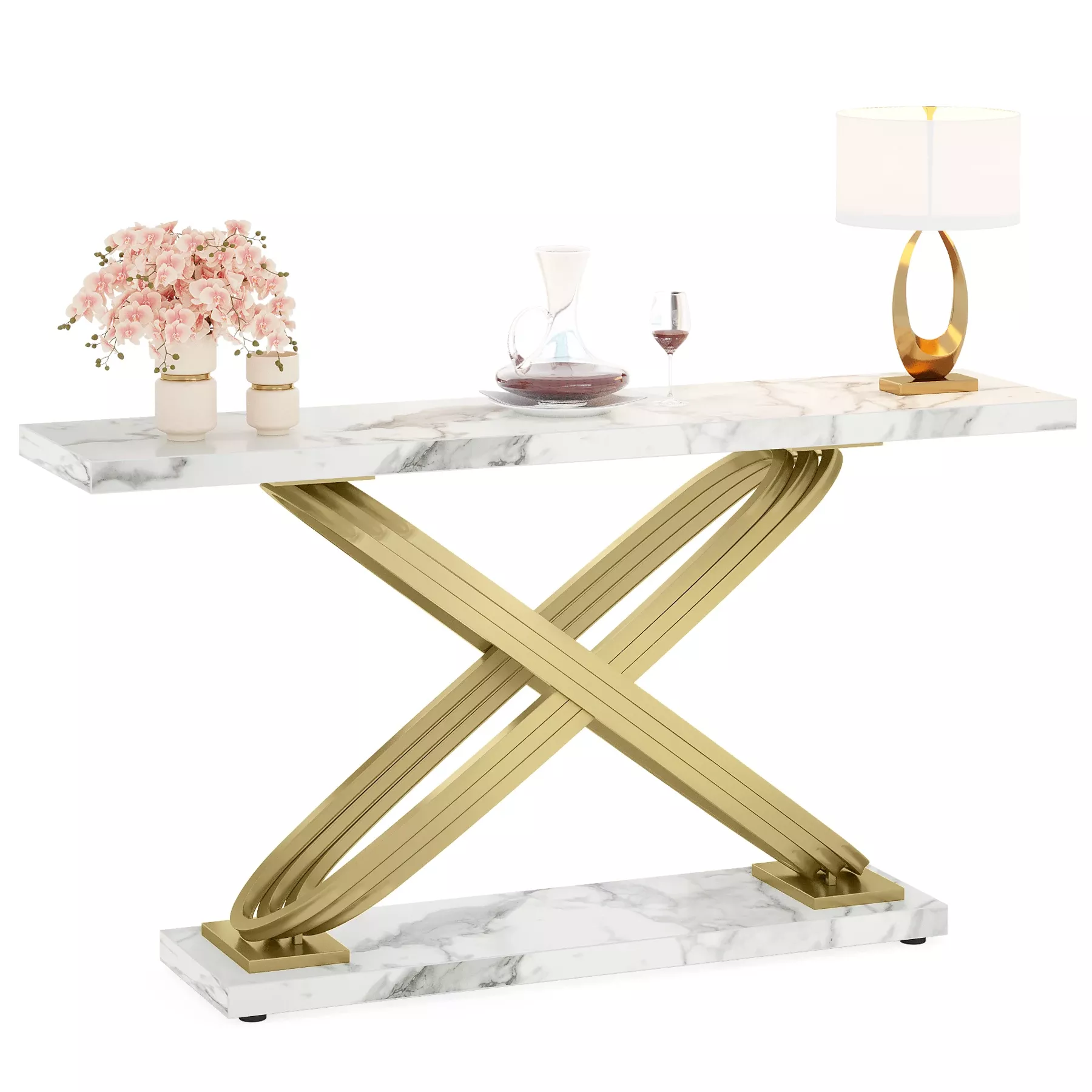 Bring sophistication and functionality into your home with the 55 Inch Modern Gold Console Table. Designed to impress, this striking piece features a stunning white faux marble tabletop that perfectly complements its golden metal frame. The elegant combination of materials gives it a luxurious charm that instantly transforms any space — from your entryway to behind your sofa or in a stylish hallway.