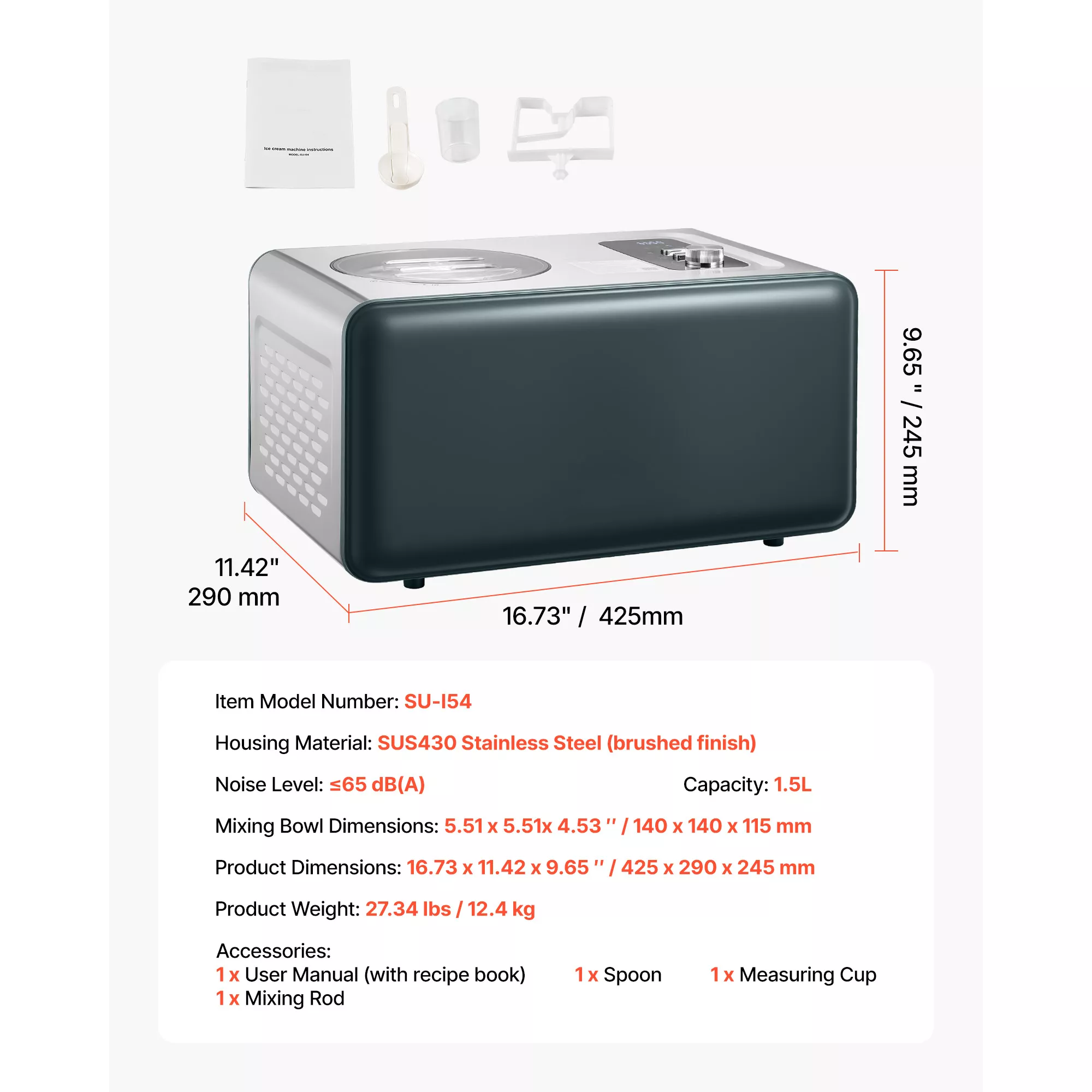 This electric ice cream maker offers three intuitive modes—ice cream, cooling, and mixing—so you can customize your dessert exactly how you like it. The built-in compressor ensures consistent freezing without the need for a pre-frozen bowl, while the powerful 150W motor churns ingredients quickly and quietly for smooth results. Its compact 1.5-quart capacity is perfect for serving 1–3 people, making it ideal for couples, small families, or dinner parties.
