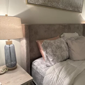 • Style: Minimalist Modern with a plush, tufted headboard