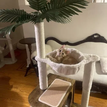 Our product stands out for its thoughtful design and superior quality. It combines a spacious cabinet large enough for a comfortable sleep or to discreetly house a litter box, a foldable litter box included for convenience, and multiple scratching posts wrapped in natural sisal rope for your cat’s scratching needs. The tree also features two top options, including a coconut palm leaf top, and a variety of lounging spots like a large-space top perch and a capacious hammock. Crafted from healthy and eco-friendly materials, it ensures your cat’s well-being while adding a stylish touch to your home decor.