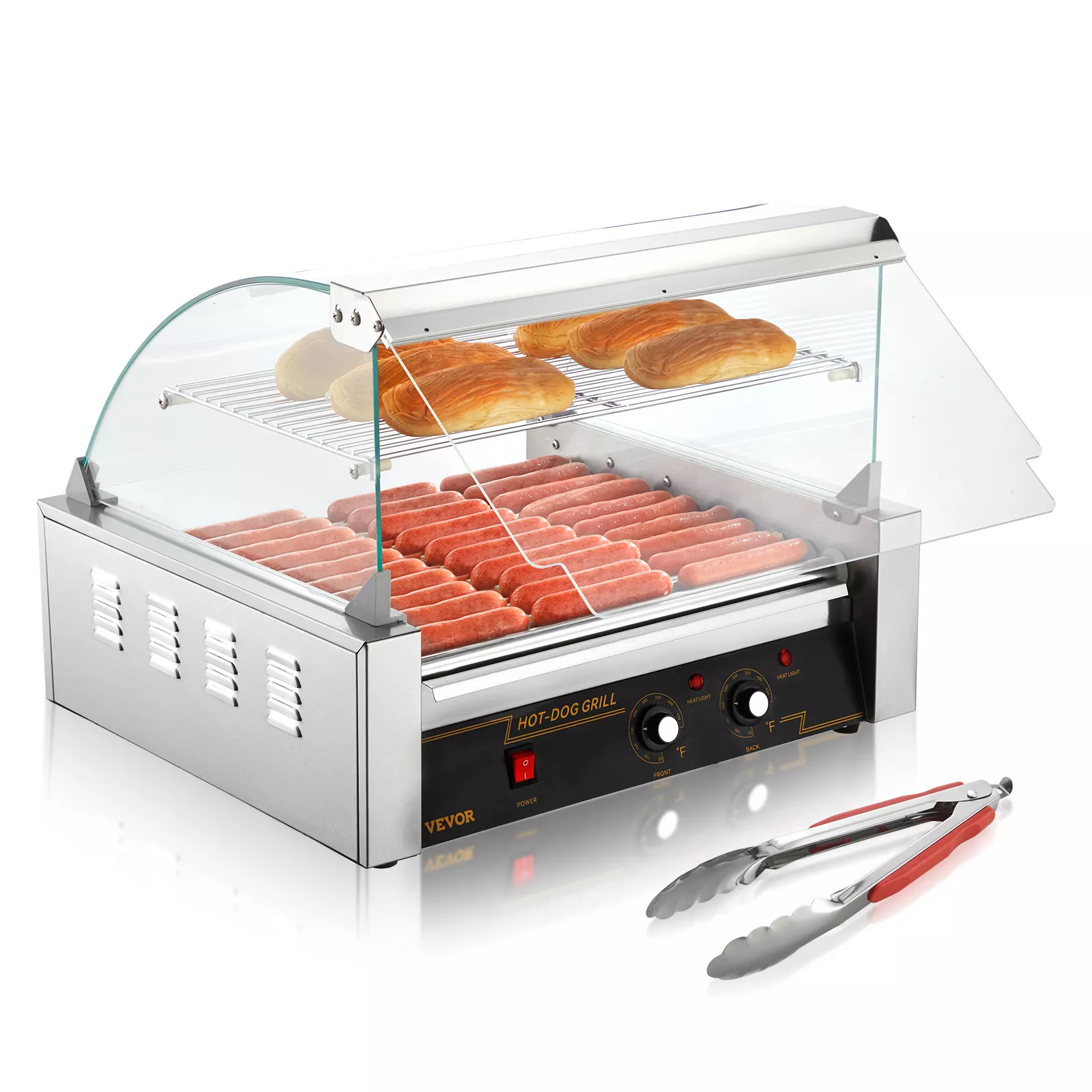 This grill features dual-temperature controls that let you cook and keep food warm at the same time—ideal for busy events and gatherings. The 360° rotating stainless steel rollers ensure every sausage is cooked evenly to perfection, while the durable construction guarantees long-lasting performance. A built-in backsplash and warming shelf make grilling more efficient and organized, helping you serve up mouth-watering results without the mess.