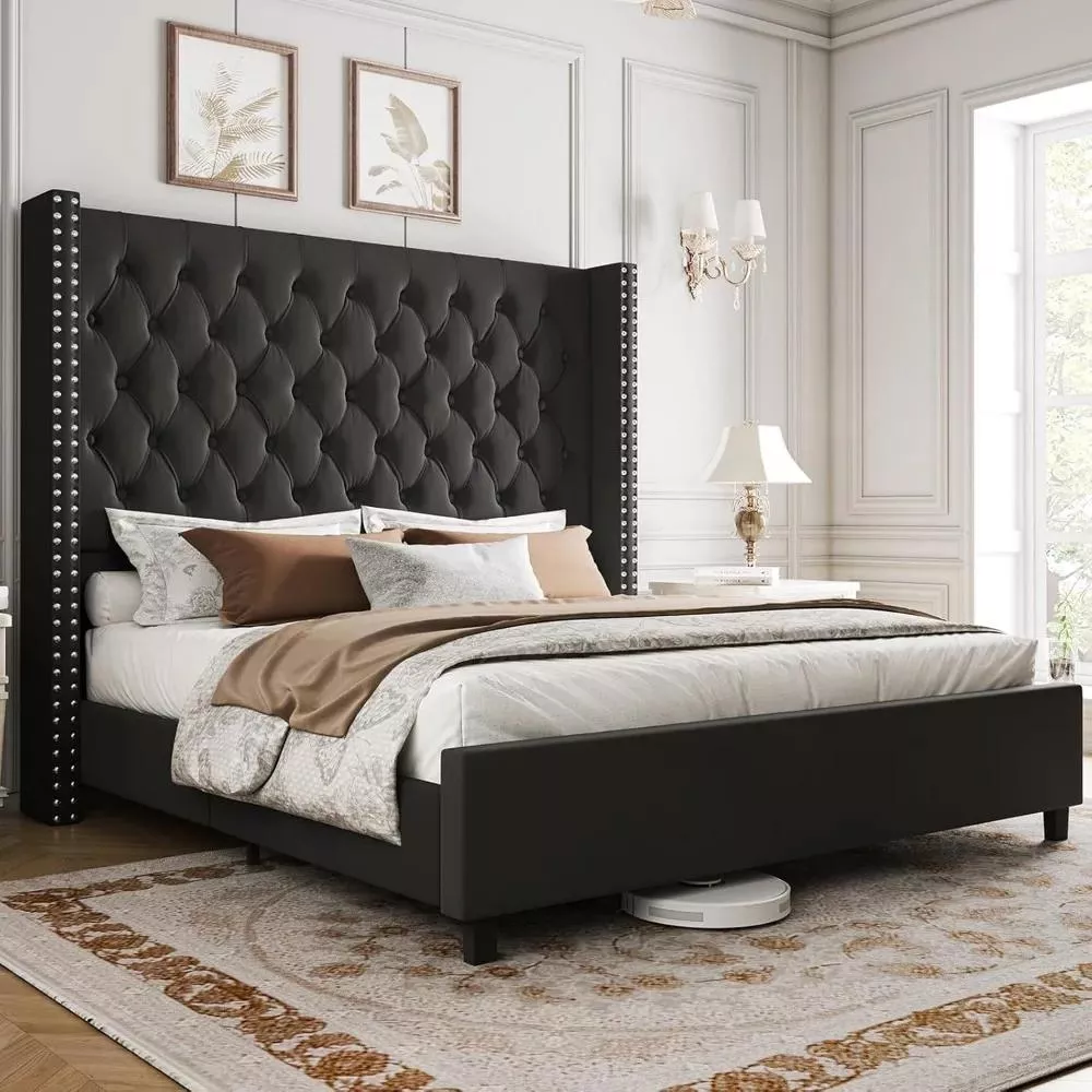 Experience luxury and comfort with our Elegant King Size Bed Frame with Tall Velvet Headboard. This stunning bed frame stands at an impressive 61.4 inches tall, offering a grand presence in your bedroom while providing a feeling of shelter and relaxation. Designed to fit mattresses ranging from 8 to 17 inches, this velvet upholstered platform bed is both stylish and practical, enhancing your sleeping environment with a touch of class.