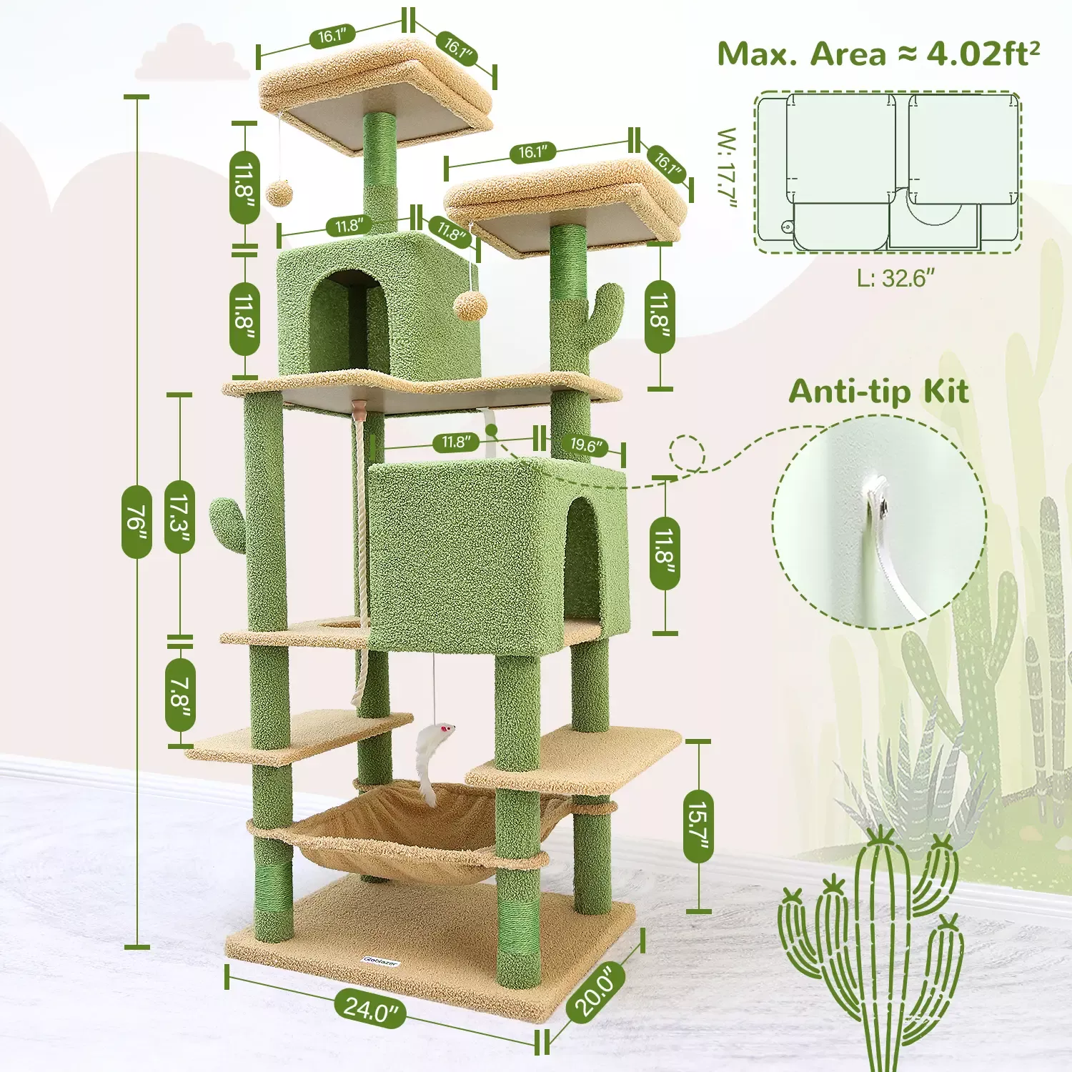Give your feline friends the ultimate indoor playground with the 76-Inch Cactus Cat Tree Tower — a stunning blend of comfort, adventure, and style. Designed to resemble a lively cactus, this towering structure brings a splash of nature into your home while offering endless fun for your cats. Its lush green tones and unique cactus design create a calming, natural vibe that instantly enhances any room’s look.
