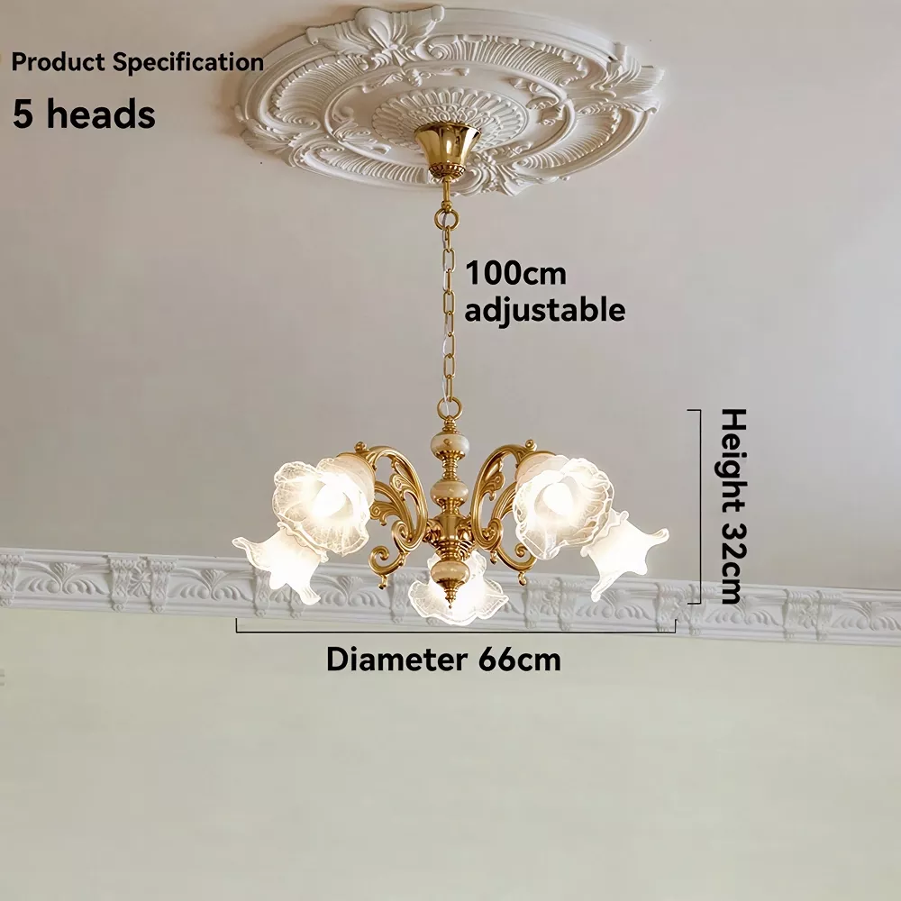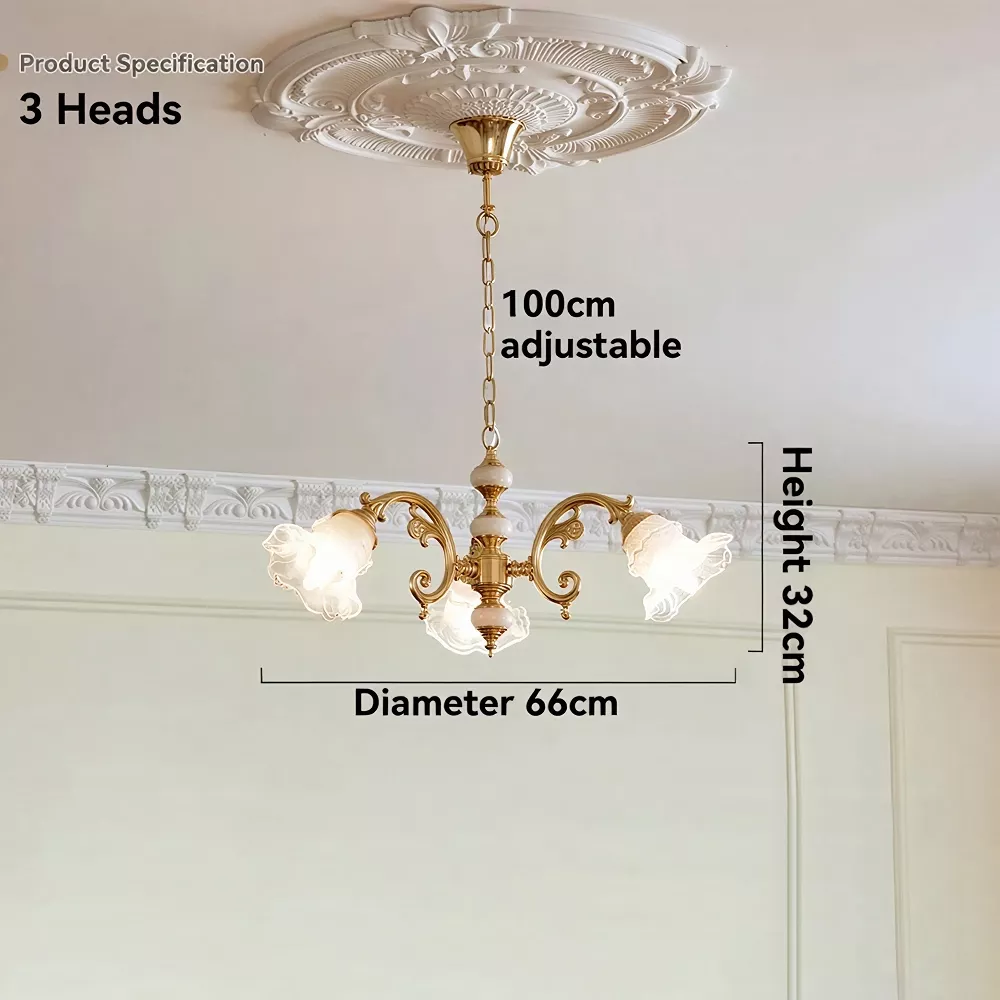 Bring a touch of Parisian charm into your space with the French Retro Copper Pendant Light. Designed with a beautiful blend of brass and glass, this chandelier showcases an exquisite flower-shaped shade that radiates sophistication. Whether suspended above your dining table or glowing gently in your bedroom, this lighting fixture transforms any room into a scene of refined elegance.