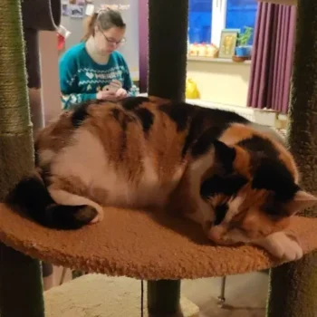 My cat's new tower has become her favorite spot for some quality bird-watching time. Assembling it was a breeze, and all the parts were included. Despite being a larger cat weighing around 10-15 pounds, she fits perfectly curled up in the circle or lounging on the edge. Although she doesn't use the enclosed section much, she's thoroughly content watching the birds and squirrels outside the window. I wholeheartedly recommend this cat tower.
