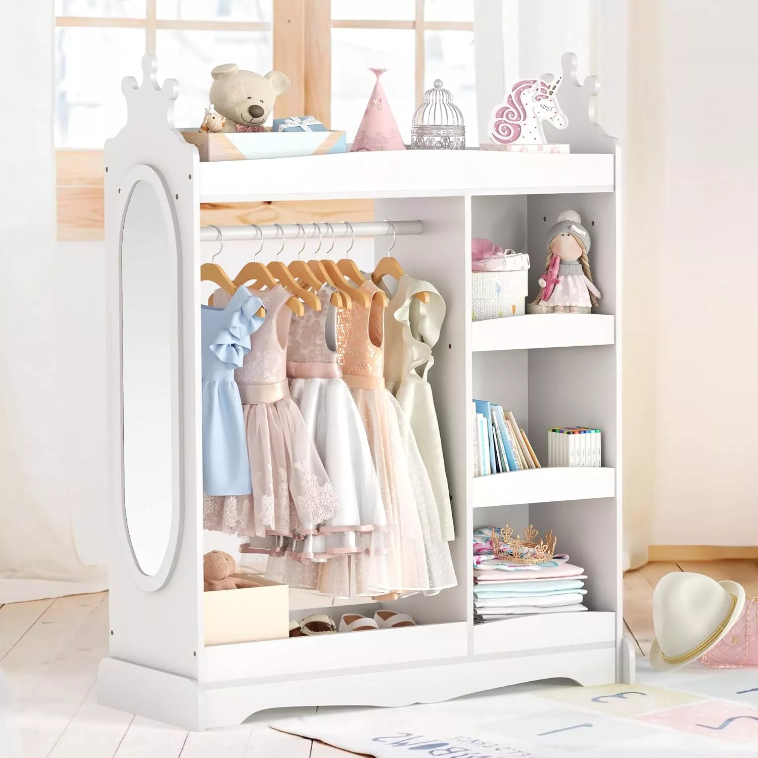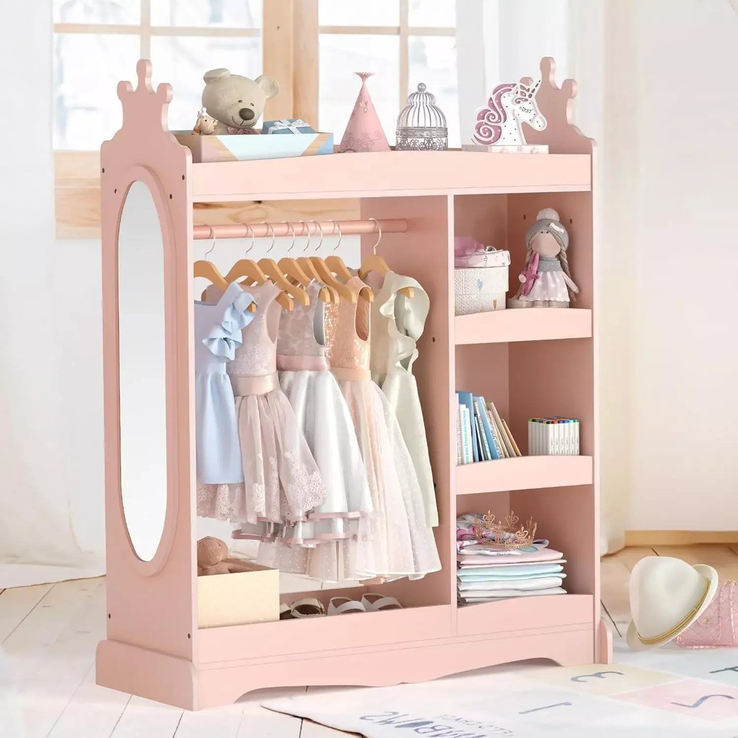 Its modern design and charming crown details make this wardrobe a delightful addition to any bedroom, playroom, classroom, or nursery. Use it as a daily clothing organizer or a dedicated dress-up center — it’s versatile enough for both practical and playful use.