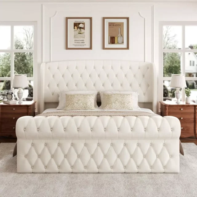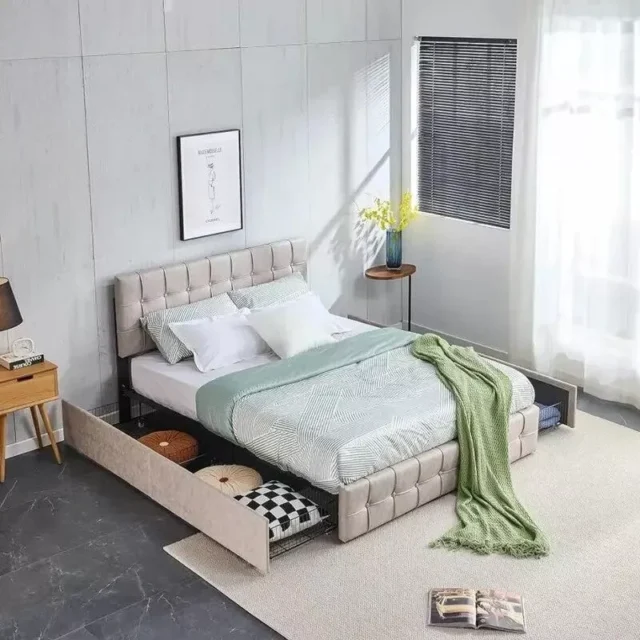 First, the two-tier storage headboard keeps your essentials within easy reach. For example, you can store books, glasses, or your phone neatly. As a result, your nightstand stays clutter-free. In addition, the open under-bed space allows easy cleaning or extra storage, which makes it perfect for compact bedrooms.