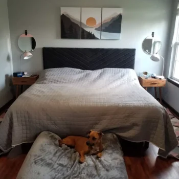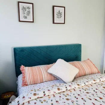 Experience the ultimate in customization and comfort with our adjustable headboard. Offering three height settings, it caters to your unique comfort needs, whether you enjoy reading in bed or watching TV. The plush upholstered headboard, measuring 76.4″L x 81.9″W x 42.5″H, is not just a statement of style but also a promise of comfort. Our bed frame’s sleek, modern design, accentuated by its stunning blue color and wood finish, effortlessly complements any bedroom decor. Its appearance embodies modern style, Scandinavian simplicity, and a hint of modern Morocco, making it a versatile addition to any interior design theme.