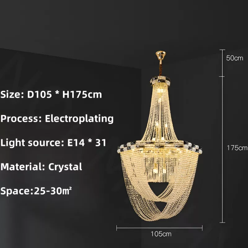 Every detail of this chandelier is made to capture attention. The combination of premium crystal elements and a durable plated iron frame ensures both beauty and strength. Fitted with over 20 LED light sources, it provides brilliant illumination that covers an area of 160–320 sq ft, making it ideal for grand open spaces. The warm, golden glow reflects beautifully through the crystal layers, turning every evening into a luxurious experience.