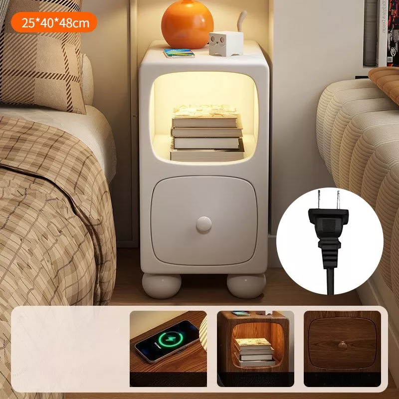 More than just a bedside table, this multifunctional piece is designed to simplify your nightly routine and elevate your comfort. Simply place your phone on the designated charging area for seamless wireless charging—no messy cables needed. A built-in circular LED light strip softly illuminates your space, serving as the perfect night lamp for late-night reading or ambient relaxation. The open grid design with divider offers convenient storage for your books, iPad, or essentials, keeping everything within easy reach.