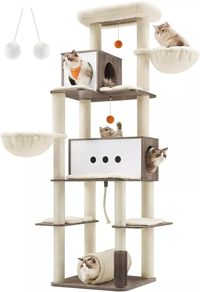 This multi-level cat condo offers 2 cozy caves, 2 plush hammocks, and a spacious top perch where your cats can lounge, observe, or nap in comfort. The roomy lower cave is ideal for bigger or chubbier cats, giving them the space they deserve. For active moments, there’s a fun tunnel to explore, 2 engaging pompoms for play (plus 2 spares), and sisal-wrapped scratching posts that keep claws healthy and furniture safe.