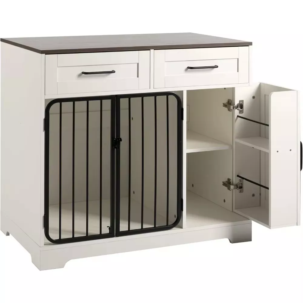 More than just a crate, this piece brings both convenience and charm. Its generous storage capacity includes a spacious tabletop ideal for décor, dog food, or everyday essentials. Two large drawers and a shelved cabinet keep toys, treats, and grooming tools neatly organized—everything your pet needs right at your fingertips.