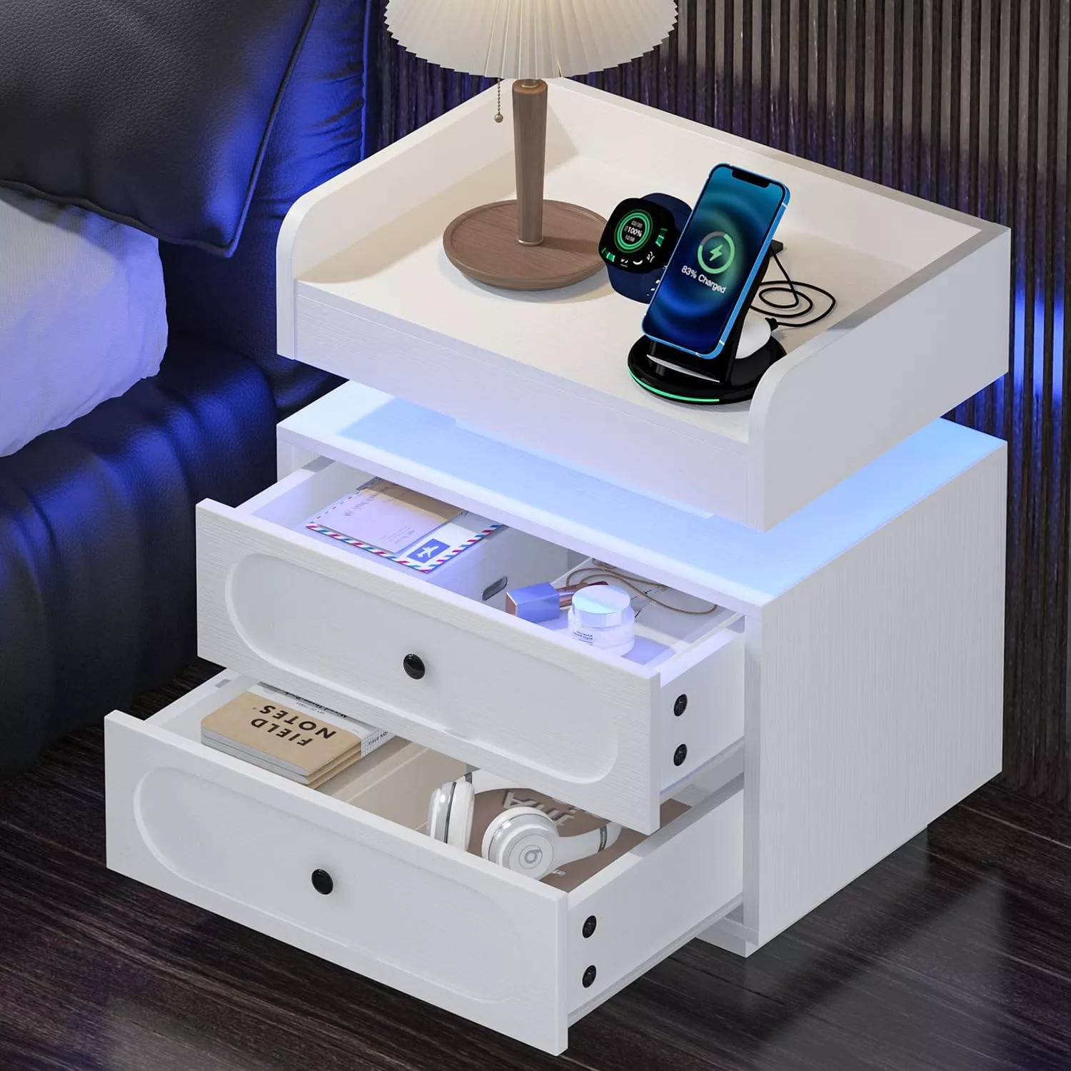 Modern LED Nightstand with Charging Station and 2 Rounded Drawers