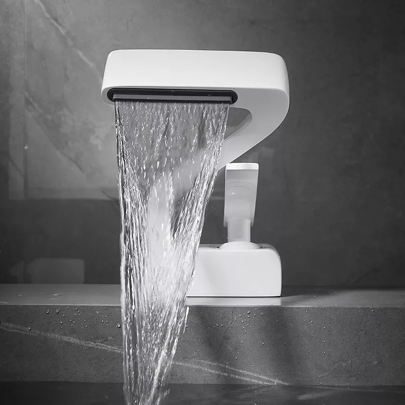 Transform your everyday routine into a luxurious experience with the Modern Waterfall Bathroom Faucet. Designed with contemporary style and precision engineering, this single-hole, deck-mounted faucet combines beauty and performance in perfect harmony. Its sleek white, gold, and black finish adds a touch of sophistication to any bathroom décor, while the stunning waterfall-style spout creates a calming and elegant water flow that turns your sink into a statement piece.