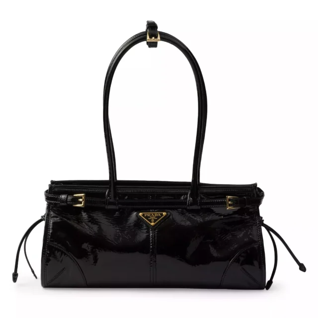 The iconic triangular Prada plaque adds a bold designer statement to the front. Leather trims enhance durability and elevate the overall look. Every detail highlights precision and timeless craftsmanship.