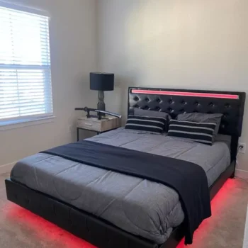 What sets this bed apart is its unique floating design combined with modern LED lighting and practical USB charging. It’s not just a bed frame; it’s a lifestyle upgrade. It’s designed for those who appreciate both style and functionality in their furniture. Embrace the future of bedroom design with our Modern Queen Size LED Upholstered Platform Bed Frame. Transform your bedroom into a sanctuary of modern comfort and style today! Don’t wait to experience the ultimate in bedroom luxury. Click to add to cart and bring home the future of sleep and style!