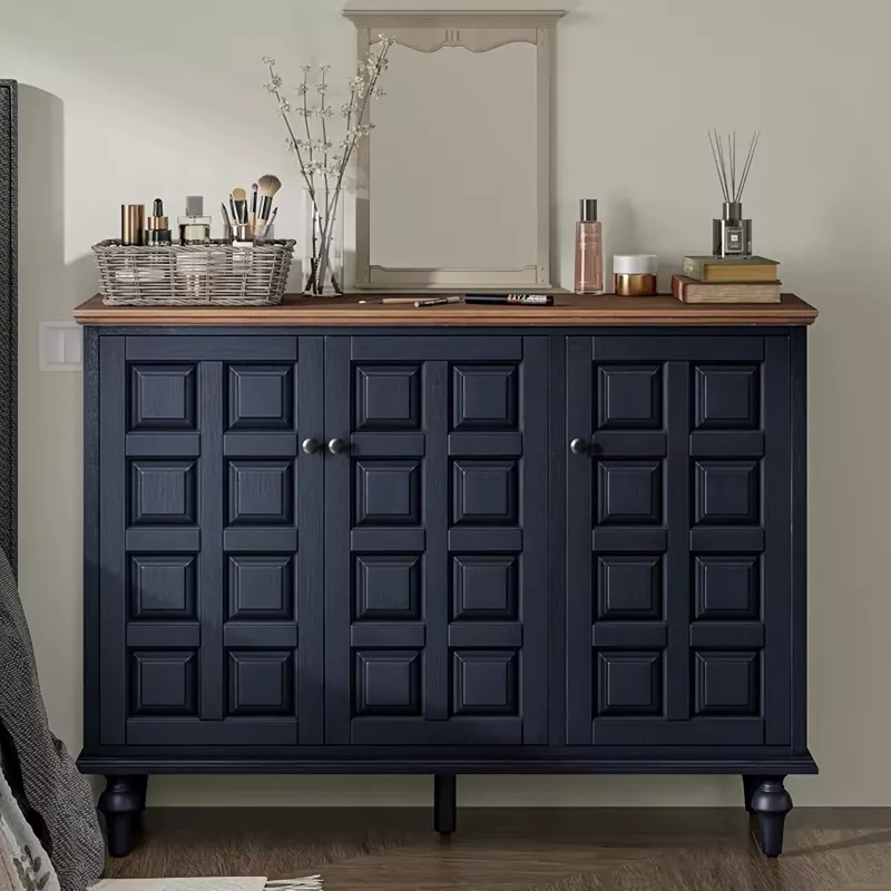 Give your home a touch of timeless charm with this Retro 3-Door Storage Cabinet featuring a distinctive plaid pattern front. With its deep blue finish and natural wood top, this cabinet effortlessly combines rustic warmth and vintage style. Perfect for your living room, bedroom, or entryway, it adds both beauty and practicality to any corner of your home.