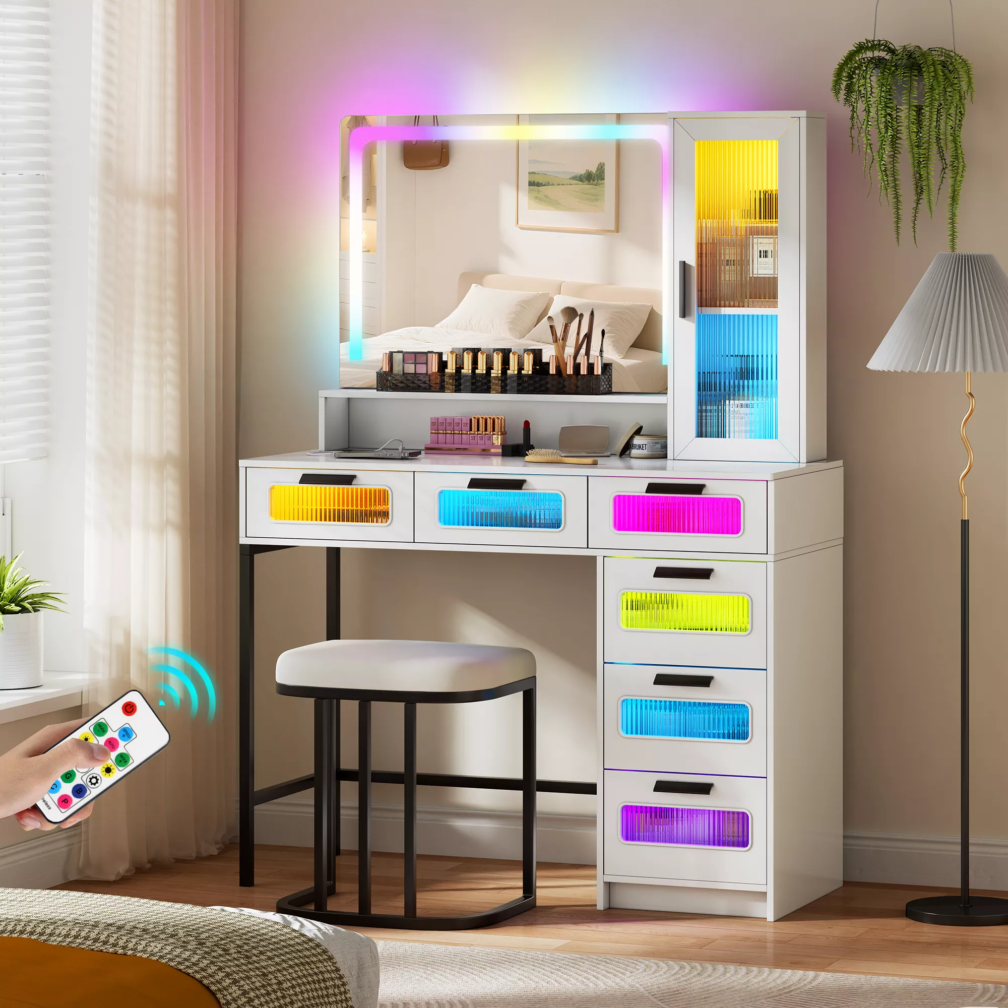 Bring glamour and convenience to your daily routine with this stunning vanity desk set. Designed for modern lifestyles, this elegant makeup vanity blends functionality with luxury, creating a perfect space for your beauty rituals. Its sleek design, large mirror, and ambient RGB lighting make every morning feel like a moment of self-care and confidence. Whether you’re getting ready for work, a date, or a night out, this vanity desk turns your bedroom into your own personal beauty studio.