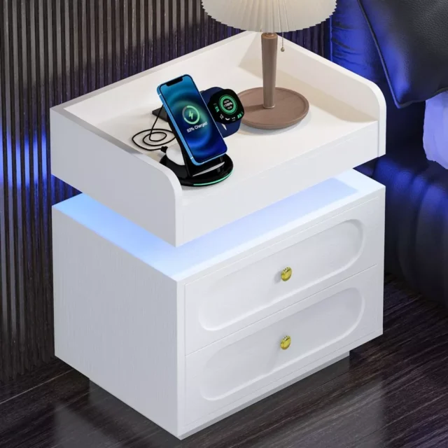Although compact, this round nightstand offers impressive storage. It measures 15.7″ in diameter and 20.1″ high, which makes it ideal for bedrooms with limited space. Meanwhile, three smooth-gliding drawers store books, chargers, skincare, and other essentials neatly out of sight. On top, the stone surface holds lamps, décor, or drinks with ease.