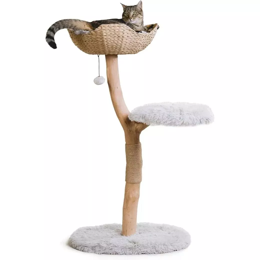 Crafted from high-quality wood, this cat tree is built to last. Its sturdy design ensures that it can support even the largest cats, giving you peace of mind while your pet enjoys their new space. The tree features a beautifully designed trunk that holds a spacious hand-woven wicker basket complete with a machine-washable cushion, allowing your cat to snuggle up in comfort. It also includes a cushioned platform step, allowing easy access to the basket while keeping your pet secure and cozy.