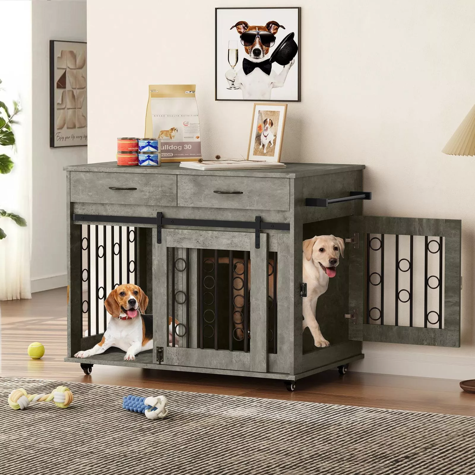 Wooden Dog Crate Furniture with Divider, Drawers & Wheels